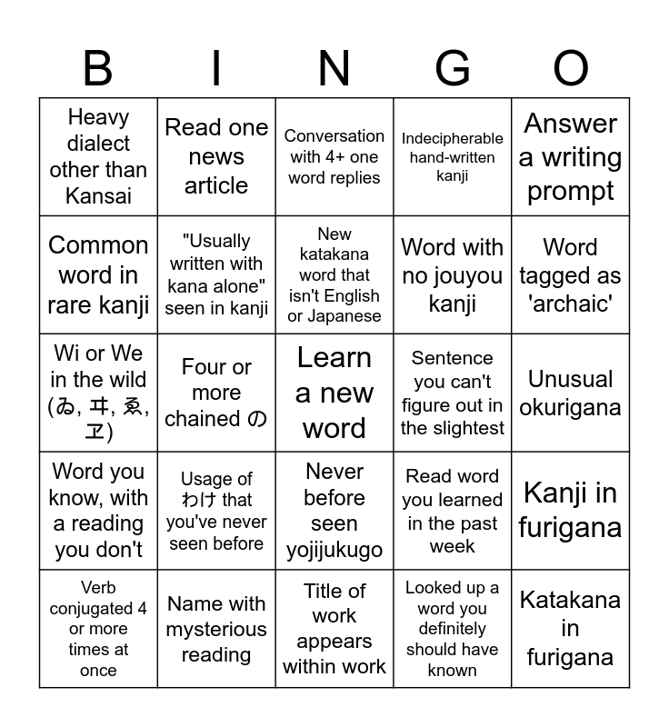 This bingo card has a free space and 24 words: Usage of わけ that you've never seen before, Name with mysterious reading, New katakana word that isn't English or Japanese, Verb conjugated 4 or more times at once, Answer a writing prompt, Heavy dialect other than Kansai, Common word in rare kanji, Read one news article, Sentence you can't figure out in the slightest, Never before seen yojijukugo, Word with no jouyou kanji, Wi or We in the wild (ゐ, ヰ, ゑ, ヱ), Read word you learned in the past week, Kanji in furigana, "Usually written with kana alone" seen in kanji, Looked up a word you definitely should have known, Unusual okurigana, Conversation with 4+ one word replies, Word tagged as 'archaic', Four or more chained の, Katakana in furigana, Word you know, with a reading you don't, Indecipherable hand-written kanji and Title of work appears within work.