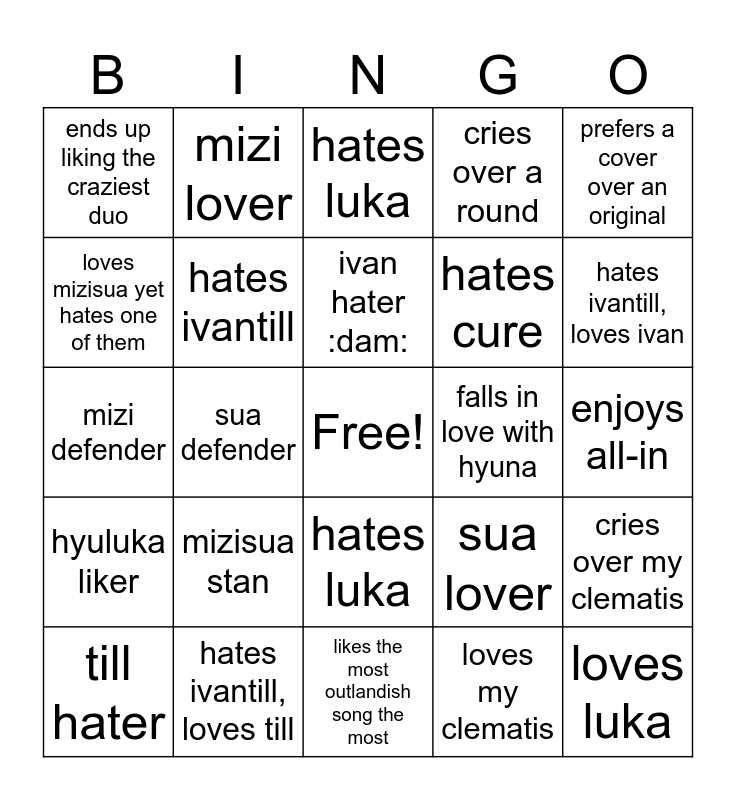 This bingo card has a free space and 24 words: till hater, mizisua stan, ivan hater :dam:, loves my clematis, prefers a cover over an original, ends up liking the craziest duo, mizi lover, hates luka, falls in love with hyuna, enjoys all-in, mizi defender, hates ivantill, sua lover, cries over my clematis, loves mizisua yet hates one of them, hates ivantill, loves till, likes the most outlandish song the most, cries over a round, hates ivantill, loves ivan, hyuluka liker, sua defender, hates luka, hates cure and loves luka.