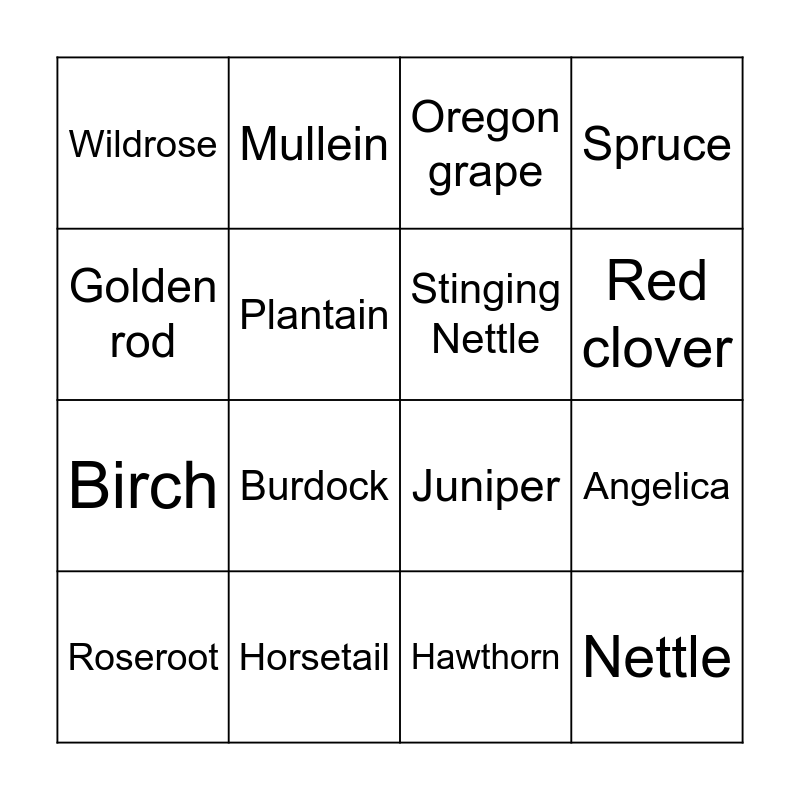 This bingo card has 24 words: Yarrow, Cattail, Red clover, Mugwort, Golden rod, Wildrose, Plantain, Mullein, Horsetail, Bearberry, Birch, Juniper, Licorice, Raspberry, Stinging Nettle, St. johns wort, Hawthorn, Oregon grape, Burdock, Angelica, Roseroot, Nettle, Spruce and Dandelion.