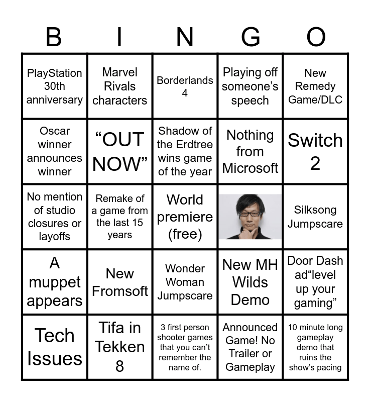 This bingo card has 1 images, a free space and 23 words: New Fromsoft, Tifa in Tekken 8, Shadow of the Erdtree wins game of the year, Tech Issues, New Remedy Game/DLC, PlayStation 30th anniversary, Oscar winner announces winner, Marvel Rivals characters, Wonder Woman Jumpscare, Nothing from Microsoft, No mention of studio closures or layoffs, New MH Wilds Demo, Door Dash ad“level up your gaming”, “OUT NOW”, Announced Game! No Trailer or Gameplay, Silksong Jumpscare, Borderlands 4, Switch 2, Remake of a game from the last 15 years, 10 minute long gameplay demo that ruins the show’s pacing, A muppet appears, Playing off someone’s speech and 3 first person shooter games that you can’t remember the name of..