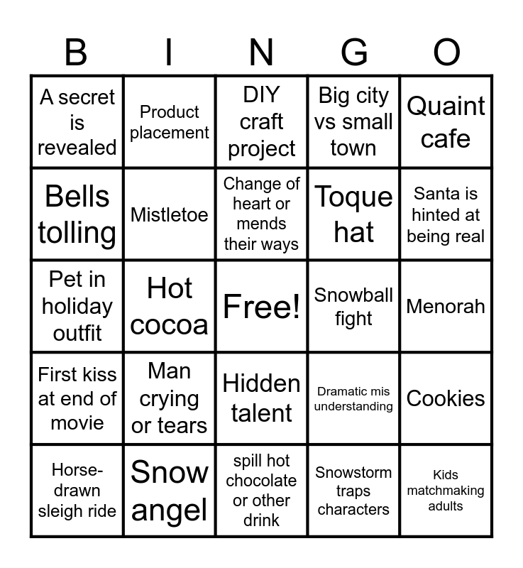 This bingo card has a free space and 67 words: Crashes into tree, Town w/ winter or Xmas name, Kindly stranger, Cookies, Sleds, No cell reception, Product placement, Gathering firewood, Change of heart or mends their ways, Extra long staring, Hidden talent, Ice sculpture, Menorah, Quaint cafe, Rivalry, Bells tolling, Hot cocoa, A secret is revealed, Car horn honking, Toque hat, Man crying or tears, First kiss at end of movie, Big city vs small town, Snowstorm traps characters, Tree lighting, Snow globe, Someone inherits family business or house, Snow at the perfect moment, Santa is hinted at being real, Sentimental ornament, Kids matchmaking adults, Montage of baking or decorating, Interrupted kiss, Old flames rekindle, Sudden Xmas miracle, Horse-drawn sleigh ride, Caroling, Dramatic mis understanding, Pet in holiday outfit, Family recipe, Someone wears plaid, Mistletoe, Snowball fight, Underdressed for the weather, Holiday festival or fair, Leave high paying job for love, Wise old mentor, Snow angel, Injury, Car won't start or flat tire, DIY craft project, Innocent comment changes everything, Character has christmassy name: Noel, Big city boss arrives to "check in", Snow man, spill hot chocolate or other drink, Ugly Xmas sweater, Character is too busy for Xmas at first, Christmas eve deadline, Heartfelt toast, Charity event or toy drive, lighting candles, Power outage, Parade, Ex shows up, Meddling best friend or sibling and Surprise promotion.