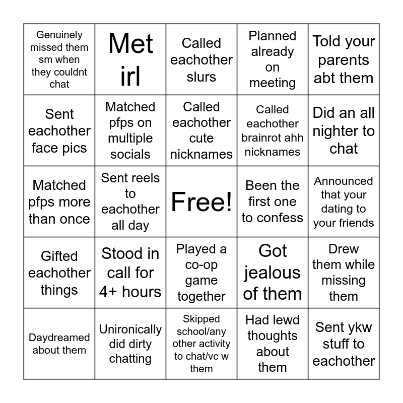 This bingo card has a free space and 24 words: Stood in call for 4+ hours, Unironically did dirty chatting, Called eachother cute nicknames, Daydreamed about them, Told your parents abt them, Genuinely missed them sm when they couldnt chat, Sent eachother face pics, Met irl, Been the first one to confess, Played a co-op game together, Called eachother brainrot ahh nicknames, Matched pfps more than once, Got jealous of them, Drew them while missing them, Matched pfps on multiple socials, Had lewd thoughts about them, Announced that your dating to your friends, Called eachother slurs, Did an all nighter to chat, Sent reels to eachother all day, Sent ykw stuff to eachother, Gifted eachother things, Planned already on meeting and Skipped school/any other activity to chat/vc w them.