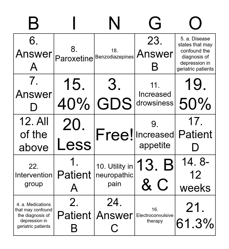 This bingo card has a free space and 24 words: 1. Patient A, 2. Patient B, 3. GDS, 4. a. Medications that may confound the diagnosis of depression in geriatric patients, 5. a. Disease states that may confound the diagnosis of depression in geriatric patients, 6. Answer A, 7. Answer D, 8. Paroxetine, 9. Increased appetite, 10. Utility in neuropathic pain, 11. Increased drowsiness, 12. All of the above, 13. B & C, 14. 8-12 weeks, 15. 40%, 16. Electroconvulsive therapy, 17. Patient D, 18. Benzodiazepines, 19. 50%, 20. Less, 21. 61.3%, 22. Intervention group, 23. Answer B and 24. Answer C.