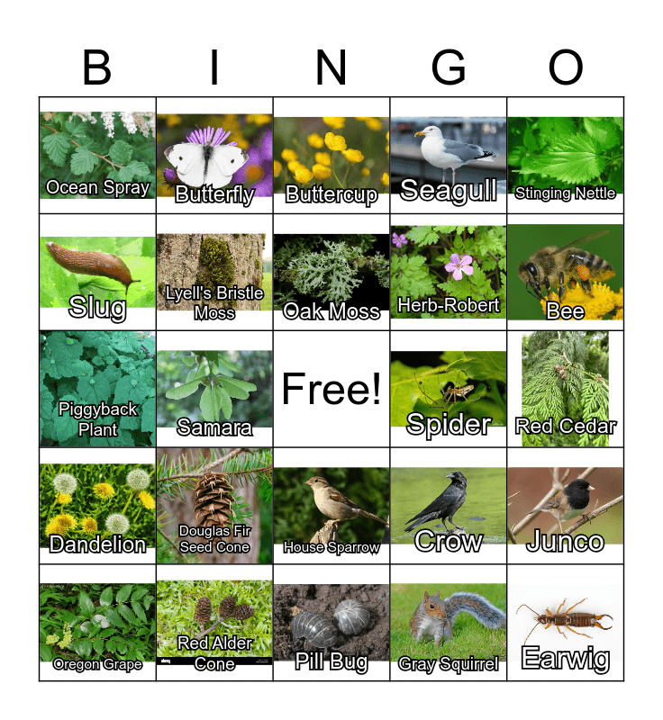 This bingo card has 52 images, a free space and 52 words: Sword Fern, Earwig, Usnea Lichen, Pill Bug, Douglas Fir Seed Cone, Spotted Towhee, Butterfly, Bryum, Slug, Worm, Lyell's Bristle Moss, Pineapple Weed, Junco, Crow, Big Leaf Maple, Black Cap Chickadee, Oak Moss, Spider, Shield Lichen, Stinging Nettle, Samara, Gray Squirrel, Ocean Spray, Herb-Robert, Cottontail Rabbit, Sunburst Lichen, Robin, Douglas Fir Pollen Cone, Bee, Baldhip Rose, Tree Burl, Seagull, Snowberry, Pacific Waterleaf, Daisy, Buttercup, Red Alder Cone, Horsetail, Salal, Vine Maple, Nootka Rose, Red Cedar, Dandelion, Thimbleberry, House Sparrow, Dragonfly, Salmonberry, Piggyback Plant, Water Skipper, Polypore Fungi, Oregon Grape and Wasp.