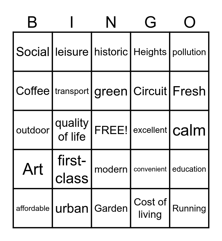 This bingo card has a free space and 32 words: Cost of living, architecture, quality of life, economy, Art, transport, pollution, education, leisure, safety, green, historic, lively, entertainment, excellent, peaceful, affordable, outdoor, modern, first-class, convenient, financial, calm, urban, Running, Heights, Circuit, Coffee, Social, Garden, Hall and Fresh.