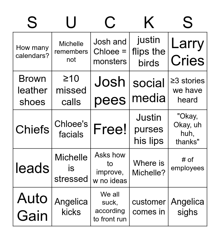 This bingo card has a free space and 24 words: Michelle is stressed, Angelica kicks, Josh pees, Auto Gain, Larry Cries, How many calendars?, Brown leather shoes, Michelle remembers not, Justin purses his lips, Asks how to improve, w no ideas, social media, Chiefs, Where is Michelle?, # of employees, ≥10 missed calls, customer comes in, "Okay, Okay, uh huh, thanks", Josh and Chloee = monsters, ≥3 stories we have heard, Chloee's facials, Angelica sighs, leads, justin flips the birds and We all suck, according to front run.