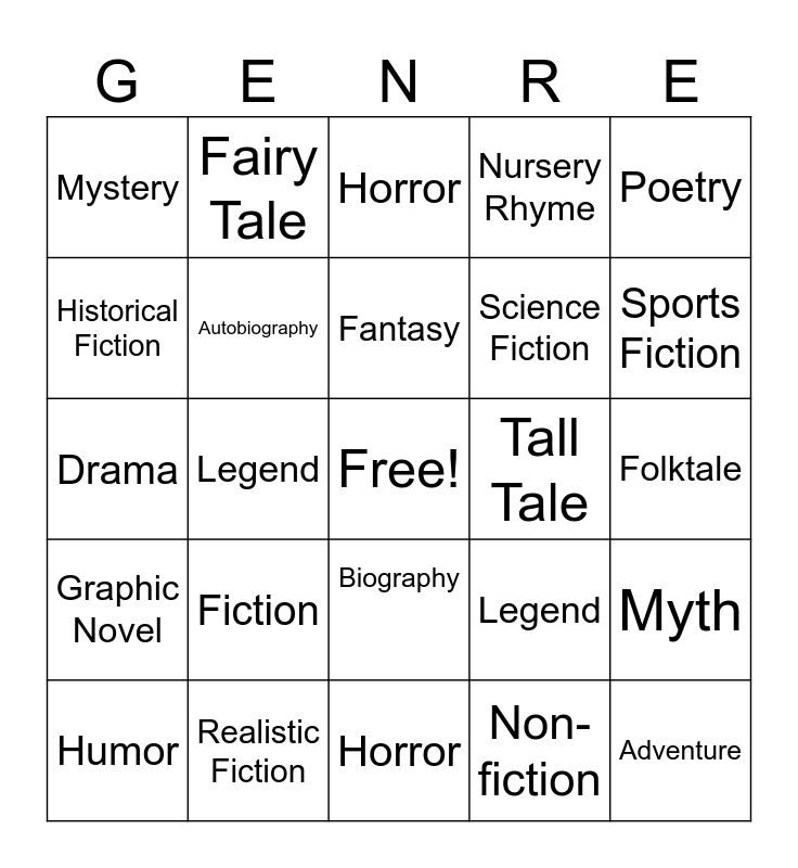 This bingo card has a free space and 24 words: Fiction, Realistic Fiction, Fantasy, Humor, Poetry, Mystery, Historical Fiction, Fairy Tale, Tall Tale, Biography, Science Fiction, Drama, Legend, Myth, Autobiography, Non-fiction, Folktale, Horror, Sports Fiction, Legend, Adventure, Graphic Novel, Nursery Rhyme and Horror.