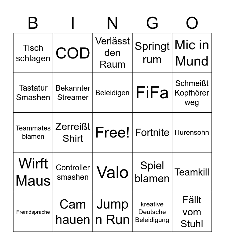 This bingo card has a free space and 24 words: Controller smashen, Cam hauen, Beleidigen, Fremdsprache, Mic in Mund, Tisch schlagen, Tastatur Smashen, COD, Fortnite, Valo, FiFa, Teammates blamen, Spiel blamen, Teamkill, Bekannter Streamer, kreative Deutsche Beleidigung, Hurensohn, Verlässt den Raum, Schmeißt Kopfhörer weg, Zerreißt Shirt, Fällt vom Stuhl, Wirft Maus, Springt rum and Jump n Run.