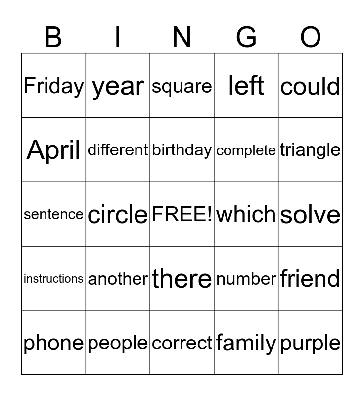 This bingo card has a free space and 25 words: another, correct, birthday, phone, could, Friday, April, year, which, there, complete, sentence, number, friend, different, problem, solve, square, triangle, circle, purple, people, instructions, left and family.