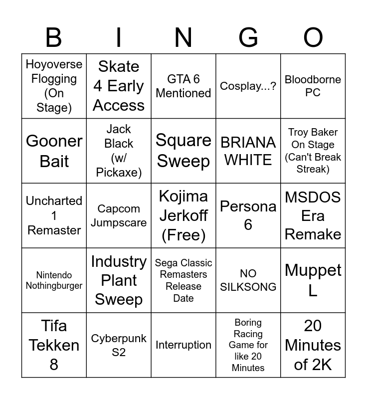 This bingo card has a free space and 24 words: Industry Plant Sweep, Cyberpunk S2, Square Sweep, Tifa Tekken 8, Bloodborne PC, Hoyoverse Flogging (On Stage), Gooner Bait, Skate 4 Early Access, Persona 6, Sega Classic Remasters Release Date, BRIANA WHITE, Uncharted 1 Remaster, NO SILKSONG, Muppet L, Jack Black (w/ Pickaxe), Boring Racing Game for like 20 Minutes, MSDOS Era Remake, GTA 6 Mentioned, Troy Baker On Stage (Can't Break Streak), Capcom Jumpscare, 20 Minutes of 2K, Nintendo Nothingburger, Cosplay...? and Interruption.