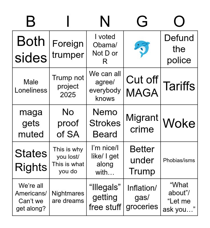 This bingo card has a free space and 31 words: “Illegals” getting free stuff, Pro-forced birth, No proof of SA, Do your research/ Let me research, Both sides, I voted Obama/ Not D or R, Trump not project 2025, Better under Trump, Migrant crime, Inflation/ gas/ groceries, Woke, “What about”/ “Let me ask you…”, Lawfare, Border, Tariffs, No new wars, Phobias/isms, This is why you lost/ This is what you do, States Rights, I’m nice/I like/ I get along with…, Defund the police, I’m just asking/ Not trying to argue, We’re all Americans/ Can’t we get along?, Foreign trumper, Cut off MAGA, Male Loneliness, 🐬, maga gets muted, Nightmares are dreams, We can all agree/ everybody knows and Grammar lessons with Manda/Panel.