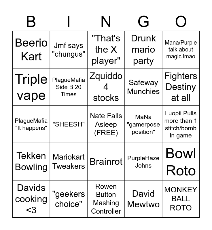 This bingo card has a free space and 24 words: Mariokart Tweakers, "geekers choice", Zquiddo 4 stocks, Davids cooking <3, Mana/Purple talk about magic lmao, Beerio Kart, Triple vape, Jmf says "chungus", MaNa "gamerpose position", Brainrot, Safeway Munchies, PlagueMafia "It happens", PurpleHaze Johns, Bowl Roto, PlagueMafia Side B 20 Times, David Mewtwo, Luopii Pulls more than 1 stitch/bomb in game, "That's the X player", Fighters Destiny at all, "SHEESH", MONKEY BALL ROTO, Tekken Bowling, Drunk mario party and Rowen Button Mashing Controller.