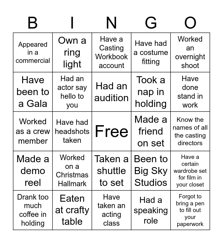 This bingo card has a free space and 24 words: Worked on a Christmas Hallmark, Eaten at crafty table, Had an audition, Drank too much coffee in holding, Worked an overnight shoot, Appeared in a commercial, Have been to a Gala, Own a ring light, Made a friend on set, Taken a shuttle to set, Took a nap in holding, Worked as a crew member, Been to Big Sky Studios, Have a certain wardrobe set for film in your closet, Had an actor say hello to you, Had a speaking role, Know the names of all the casting directors, Have a Casting Workbook account, Have done stand in work, Have had headshots taken, Forgot to bring a pen to fill out your paperwork, Made a demo reel, Have had a costume fitting and Have taken an acting class.