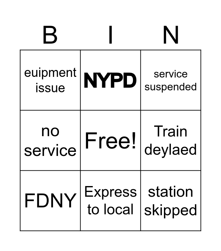 This bingo card has a free space and 8 words: Train deylaed, service suspended, NYPD, FDNY, euipment issue, station skipped, no service and Express to local.