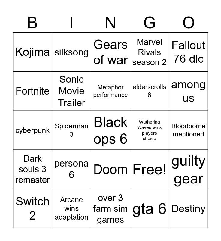 This bingo card has 25 words: persona 6, over 3 farm sim games, Metaphor performance, Switch 2, Fallout 76 dlc, Kojima, Fortnite, silksong, Wuthering Waves wins players choice, Doom, elderscrolls 6, cyberpunk, Free!, guilty gear, Sonic Movie Trailer, Destiny, Bloodborne mentioned, Gears of war, among us, Spiderman 3, Black ops 6, Arcane wins adaptation, Dark souls 3 remaster, Marvel Rivals season 2 and gta 6.