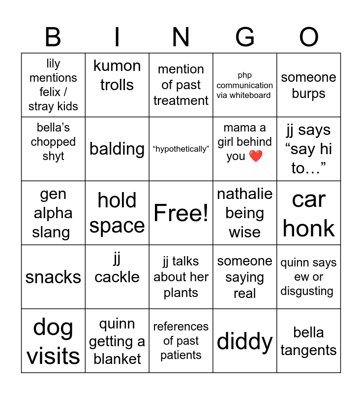 This bingo card has a free space and 24 words: jj cackle, quinn getting a blanket, “hypothetically”, dog visits, someone burps, lily mentions felix / stray kids, bella’s chopped shyt, kumon trolls, nathalie being wise, jj talks about her plants, mama a girl behind you ❤️, gen alpha slang, someone saying real, quinn says ew or disgusting, balding, diddy, car honk, mention of past treatment, jj says “say hi to…”, hold space, bella tangents, snacks, php communication via whiteboard and references of past patients.