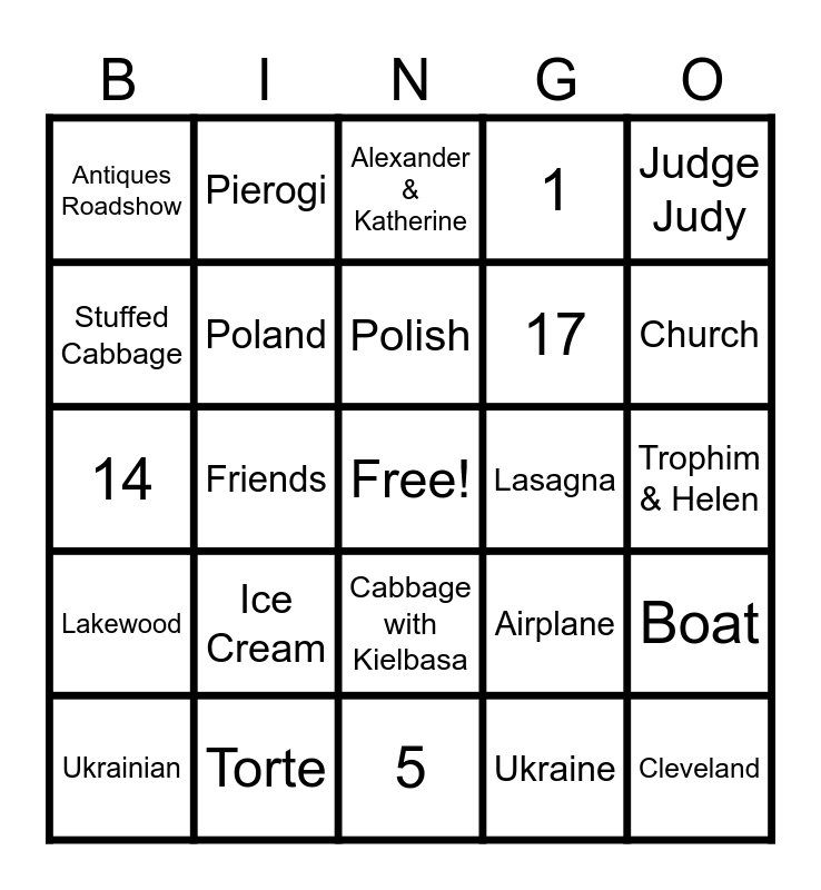 This bingo card has a free space and 24 words: Ice Cream, Torte, Polish, Ukrainian, Judge Judy, Antiques Roadshow, Stuffed Cabbage, Pierogi, Lasagna, Cabbage with Kielbasa, 17, 14, Airplane, Boat, Poland, Ukraine, Trophim & Helen, Alexander & Katherine, Church, Friends, Cleveland, Lakewood, 1 and 5.