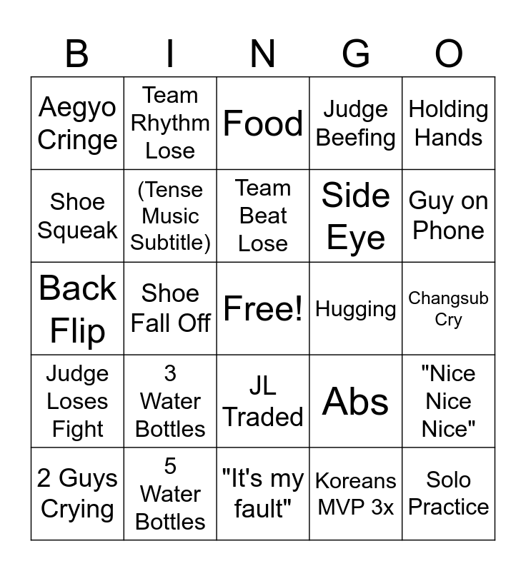 This bingo card has a free space and 24 words: 3 Water Bottles, 5 Water Bottles, Team Beat Lose, 2 Guys Crying, Holding Hands, Aegyo Cringe, Shoe Squeak, Team Rhythm Lose, Hugging, JL Traded, Side Eye, Back Flip, Abs, "Nice Nice Nice", (Tense Music Subtitle), Koreans MVP 3x, Changsub Cry, Food, Guy on Phone, Shoe Fall Off, Solo Practice, Judge Loses Fight, Judge Beefing and "It's my fault".