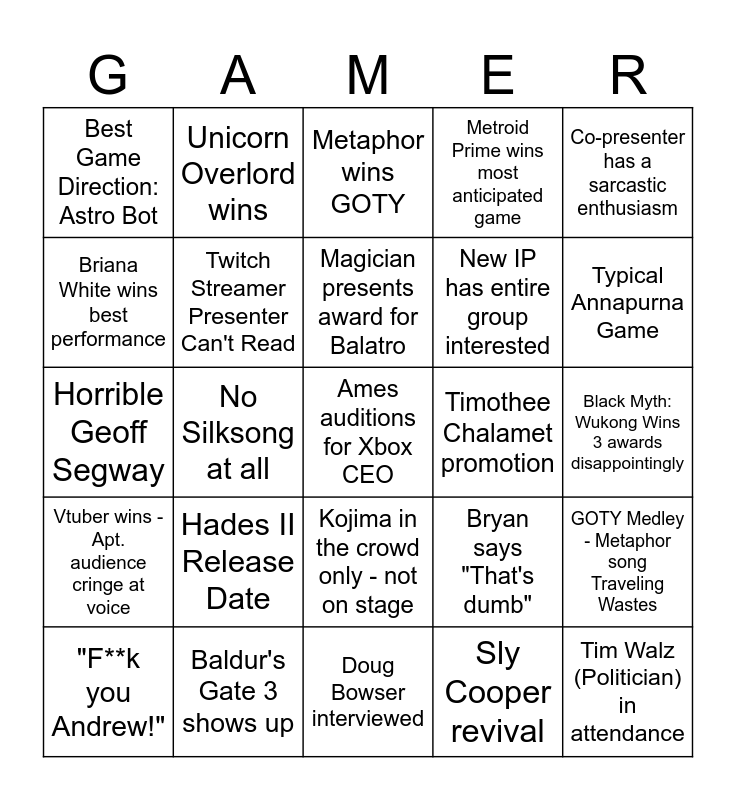 This bingo card has a free space and 24 words: Hades II Release Date, Baldur's Gate 3 shows up, Magician presents award for Balatro, "F**k you Andrew!", Co-presenter has a sarcastic enthusiasm, Best Game Direction: Astro Bot, Briana White wins best performance, Unicorn Overlord wins, Timothee Chalamet promotion, Kojima in the crowd only - not on stage, New IP has entire group interested, Horrible Geoff Segway, Bryan says "That's dumb", GOTY Medley - Metaphor song Traveling Wastes, Twitch Streamer Presenter Can't Read, Sly Cooper revival, Black Myth: Wukong Wins 3 awards disappointingly, Metaphor wins GOTY, Typical Annapurna Game, No Silksong at all, Tim Walz (Politician) in attendance, Vtuber wins - Apt. audience cringe at voice, Metroid Prime wins most anticipated game and Doug Bowser interviewed.