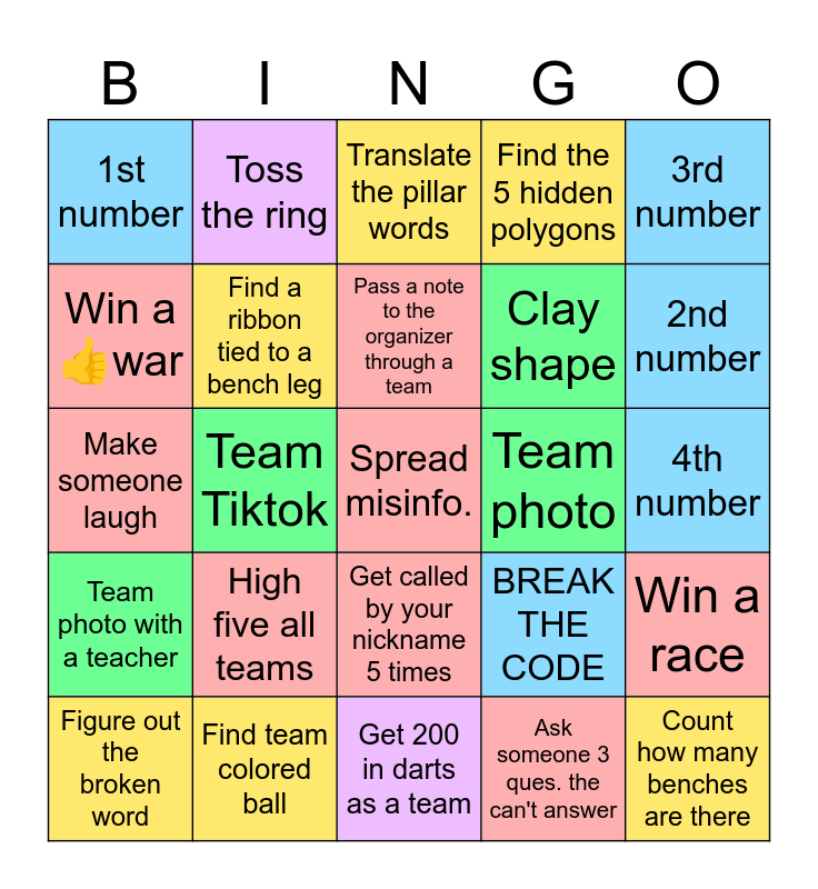 This bingo card has 25 words: High five all teams, Get 200 in darts as a team, Pass a note to the organizer through a team, Figure out the broken word, 3rd number, 1st number, Win a 👍war, Toss the ring, Team photo, Get called by your nickname 5 times, Clay shape, Make someone laugh, BREAK THE CODE, Win a race, Find a ribbon tied to a bench leg, Count how many benches are there, 4th number, Translate the pillar words, 2nd number, Team Tiktok, Spread misinfo., Find team colored ball, Team photo with a teacher, Find the 5 hidden polygons and Ask someone 3 ques. the can't answer.