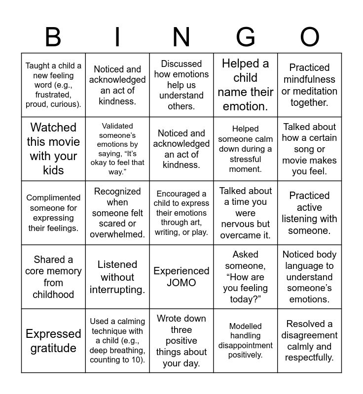 This bingo card has a free space and 24 words: Listened without interrupting., Used a calming technique with a child (e.g., deep breathing, counting to 10)., Noticed and acknowledged an act of kindness., Expressed gratitude, Practiced mindfulness or meditation together., Taught a child a new feeling word (e.g., frustrated, proud, curious)., Watched this movie with your kids, Noticed and acknowledged an act of kindness., Talked about a time you were nervous but overcame it., Experienced JOMO, Helped someone calm down during a stressful moment., Complimented someone for expressing their feelings., Asked someone, “How are you feeling today?”, Noticed body language to understand someone’s emotions., Validated someone’s emotions by saying, “It’s okay to feel that way.”, Modelled handling disappointment positively., Practiced active listening with someone., Discussed how emotions help us understand others., Talked about how a certain song or movie makes you feel., Recognized when someone felt scared or overwhelmed., Resolved a disagreement calmly and respectfully., Shared a core memory from childhood, Helped a child name their emotion. and Wrote down three positive things about your day..