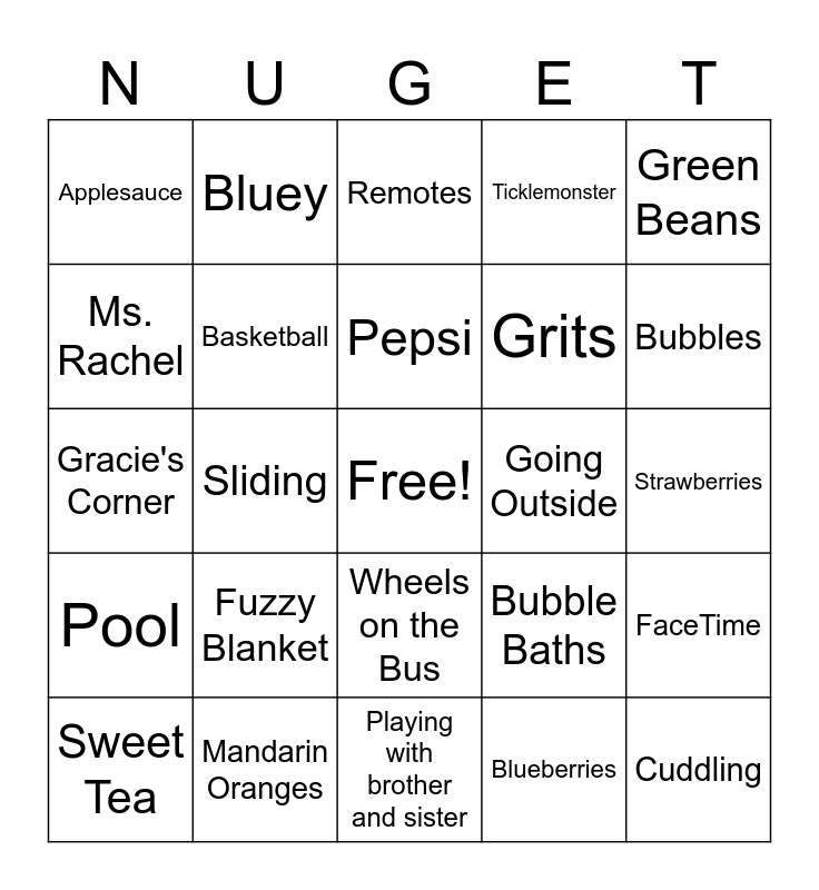 This bingo card has a free space and 24 words: Fuzzy Blanket, Mandarin Oranges, Pepsi, Sweet Tea, Green Beans, Applesauce, Ms. Rachel, Bluey, Going Outside, Wheels on the Bus, Grits, Gracie's Corner, Bubble Baths, FaceTime, Basketball, Blueberries, Strawberries, Remotes, Bubbles, Sliding, Cuddling, Pool, Ticklemonster and Playing with brother and sister.