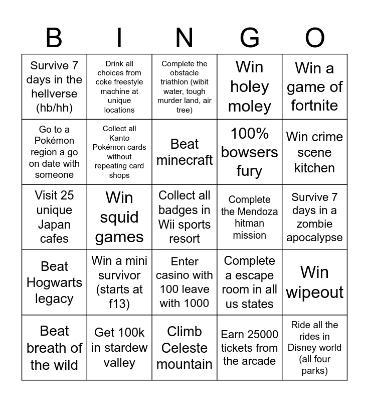 This bingo card has 25 words: Win a mini survivor (starts at f13), Climb Celeste mountain, Beat minecraft, Beat breath of the wild, Win a game of fortnite, Survive 7 days in the hellverse (hb/hh), Go to a Pokémon region a go on date with someone, Drink all choices from coke freestyle machine at unique locations, Complete the Mendoza hitman mission, Enter casino with 100 leave with 1000, 100% bowsers fury, Visit 25 unique Japan cafes, Complete a escape room in all us states, Win wipeout, Collect all Kanto Pokémon cards without repeating card shops, Ride all the rides in Disney world (all four parks), Survive 7 days in a zombie apocalypse, Complete the obstacle triathlon (wibit water, tough murder land, air tree), Win crime scene kitchen, Win squid games, Collect all badges in Wii sports resort, Get 100k in stardew valley, Beat Hogwarts legacy, Win holey moley and Earn 25000 tickets from the arcade.