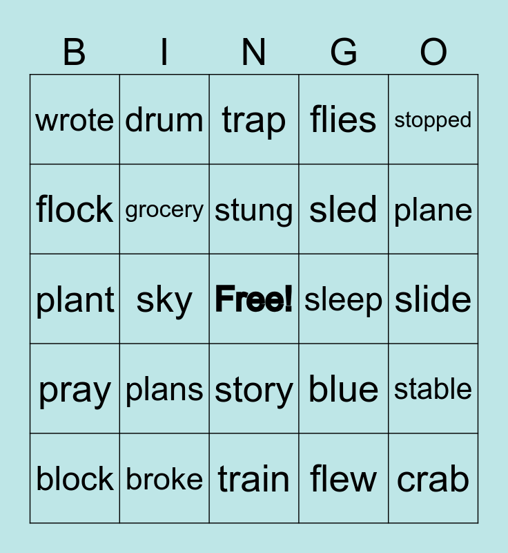 This bingo card has a free space and 24 words: plans, broke, stung, block, stopped, wrote, flock, drum, sleep, story, sled, plant, blue, stable, grocery, flew, slide, trap, plane, sky, crab, pray, flies and train.