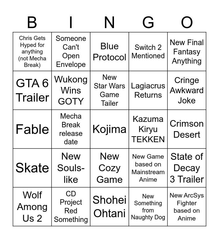 This bingo card has a free space and 24 words: New Souls-like, CD Project Red Something, New Star Wars Game Tailer, Wolf Among Us 2, New Final Fantasy Anything, Chris Gets Hyped for anything (not Mecha Break), GTA 6 Trailer, Someone Can't Open Envelope, Kazuma Kiryu TEKKEN, New Cozy Game, Lagiacrus Returns, Fable, New Game based on Mainstream Anime, State of Decay 3 Trailer, Wukong Wins GOTY, New Something from Naughty Dog, Crimson Desert, Blue Protocol, Cringe Awkward Joke, Mecha Break release date, New ArcSys Fighter based on Anime, Skate, Switch 2 Mentioned and Shohei Ohtani.