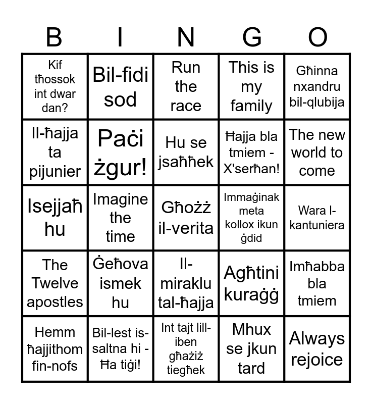 This bingo card has a free space and 24 words: Ġeħova ismek hu, Bil-lest is-saltna hi - Ħa tiġi!, Hu se jsaħħek, Hemm ħajjithom fin-nofs, Għinna nxandru bil-qlubija, Kif tħossok int dwar dan?, Il-ħajja ta pijunier, Bil-fidi sod, Immaġinak meta kollox ikun ġdid, Il-miraklu tal-ħajja, Ħajja bla tmiem - X'serħan!, Isejjaħ hu, Agħtini kuraġġ, Imħabba bla tmiem, Paċi żgur!, Mhux se jkun tard, Wara l-kantuniera, Run the race, The new world to come, Imagine the time, Always rejoice, The Twelve apostles, This is my family and Int tajt lill-iben għażiż tiegħek.