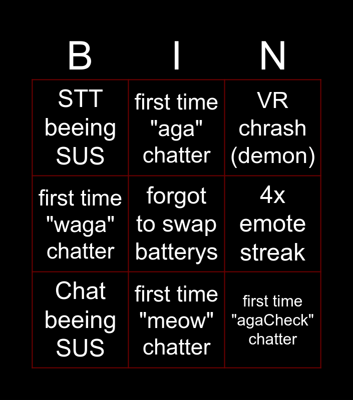 This bingo card has a free space and 8 words: 4x emote streak, VR chrash (demon), first time "aga" chatter, Chat beeing SUS, STT beeing SUS, first time "agaCheck" chatter, first time "waga" chatter and first time "meow" chatter.