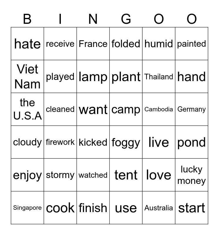This bingo card has 36 words: tent, watched, use, Viet Nam, cloudy, camp, played, finish, humid, love, hand, folded, lucky money, cleaned, plant, hate, enjoy, Cambodia, the U.S.A, France, want, firework, foggy, kicked, live, receive, Thailand, cook, lamp, painted, start, Singapore, pond, Germany, stormy and Australia.