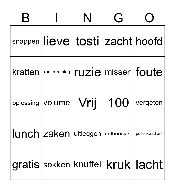 This bingo card has a free space and 37 words: spijt, bingo, inzoomen, kanjertraining, pettenkwadrant, zaken, ruzie, oordeel, hoofd, pardon, volume, zacht, lacht, vergeten, kratten, lunch, filet, tosti, uitleggen, 100, snappen, foute, gratis, knuffel, troost, kruk, lieve, Italië, Malawi, belde, lijn, sokken, oplossing, klagen, enthousiast, missen and schenken.