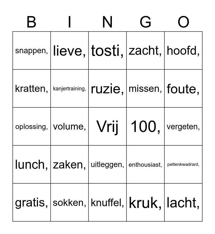 This bingo card has a free space and 37 words: spijt,, bingo,, inzoomen,, kanjertraining,, pettenkwadrant,, zaken,, ruzie,, oordeel,, hoofd,, pardon,, volume,, zacht,, lacht,, vergeten,, kratten,, lunch,, filet,, tosti,, uitleggen,, 100,, snappen,, foute,, gratis,, knuffel,, troost,, kruk,, lieve,, Italië,, Malawi,, belde,, lijn,, sokken,, oplossing,, klagen,, enthousiast,, missen, and schenken.