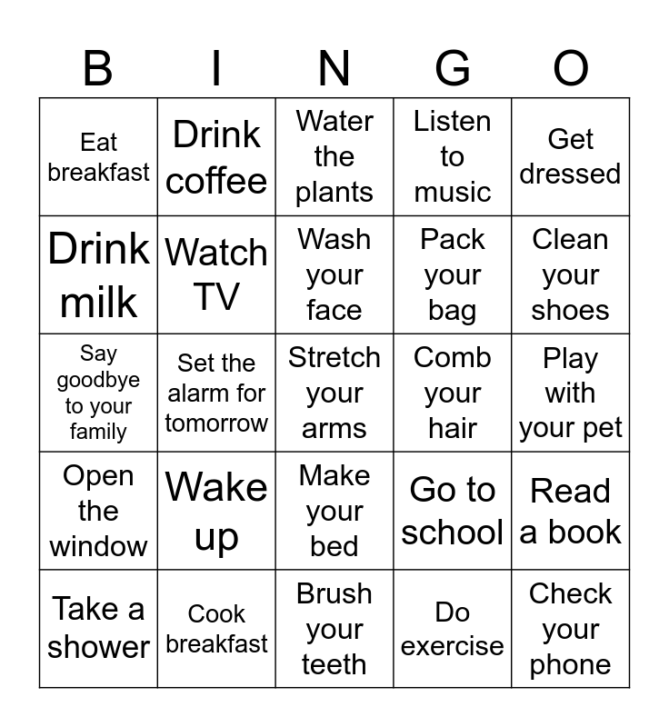 This bingo card has 25 words: Wake up, Brush your teeth, Wash your face, Take a shower, Get dressed, Eat breakfast, Drink milk, Drink coffee, Comb your hair, Make your bed, Pack your bag, Say goodbye to your family, Go to school, Read a book, Watch TV, Check your phone, Play with your pet, Water the plants, Clean your shoes, Set the alarm for tomorrow, Stretch your arms, Cook breakfast, Open the window, Listen to music and Do exercise.