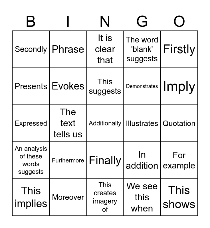 This bingo card has a free space and 24 words: Furthermore, Moreover, This suggests, This implies, Firstly, Secondly, Presents, Phrase, Illustrates, Finally, Demonstrates, Expressed, In addition, For example, Evokes, We see this when, Quotation, It is clear that, Imply, The text tells us, This shows, An analysis of these words suggests, The word 'blank' suggests and This creates imagery of.