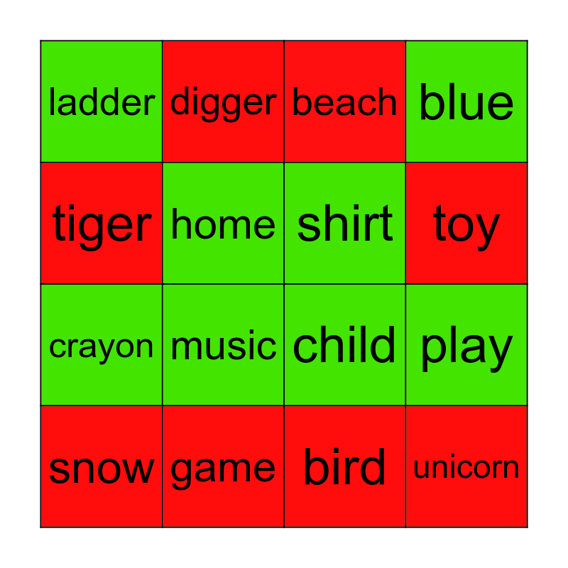 This bingo card has 16 words: game, play, beach, ladder, crayon, digger, child, bird, tiger, home, snow, blue, music, toy, shirt and unicorn.