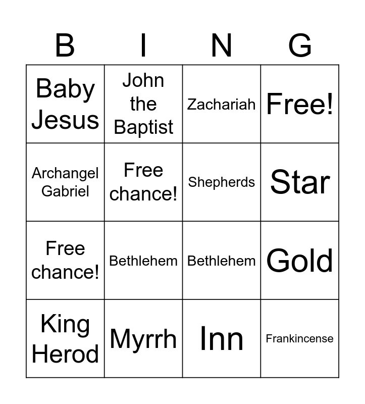 This bingo card has 23 words: Frankincense, Mary and Joseph, Star, Manger, Archangel Gabriel, Baby Jesus, Free chance!, John the Baptist, King Herod, Donkey, Bethlehem, Free chance!, Gold coins, Shepherds, Myrrh, Wise men, Zachariah, Bethlehem, Shepherds, Gold, Free!, Inn and Free!.