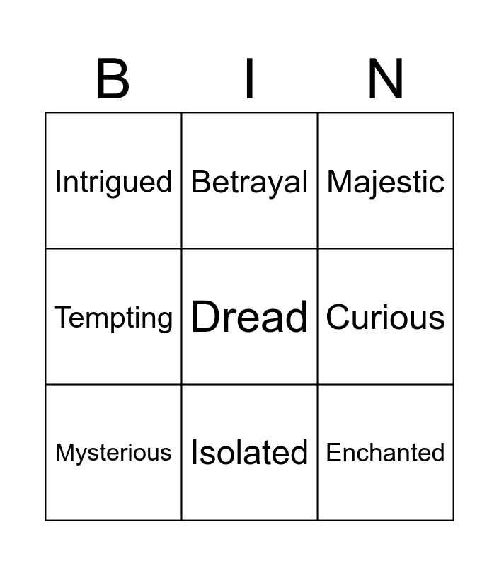 This bingo card has a free space and 8 words: Curious, Majestic, Betrayal, Mysterious, Intrigued, Enchanted, Tempting and Isolated.