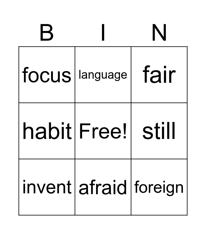 This bingo card has a free space and 10 words: afraid, fair, focus, foreign, habit, invent, language, nation, still and wise.