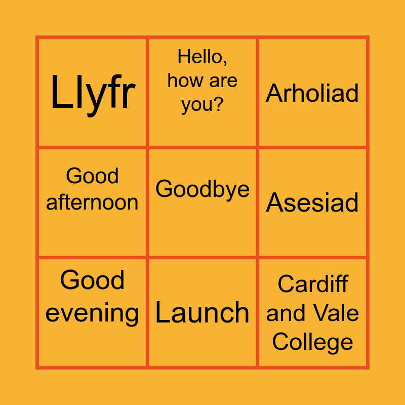 This bingo card has 14 words: Good morning, Table, Good evening, Hello, how are you?, Good afternoon, Goodbye, Cardiff and Vale College, Welsh for all, Launch, Llyfr, Canolfan sgiliau, Asesiad, Arholiad and Croeso.