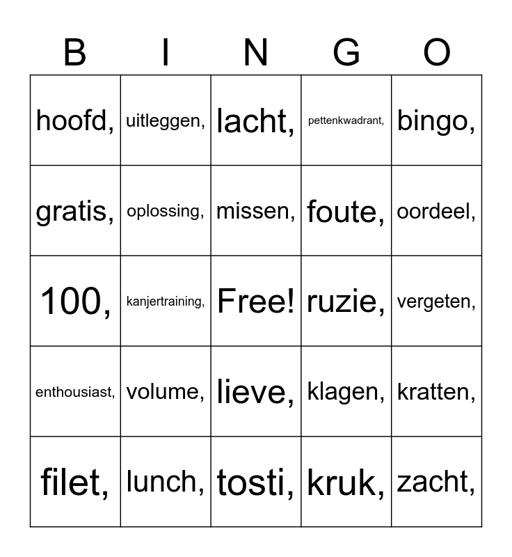 This bingo card has a free space and 36 words: belde,, lijn,, sokken,, oplossing,, klagen,, enthousiast,, missen,, schenkenspijt,, bingo,, inzoomen,, kanjertraining,, pettenkwadrant,, zaken,, ruzie,, oordeel,, hoofd,, pardon,, volume,, zacht,, lacht,, vergeten,, kratten,, lunch,, filet,, tosti,, uitleggen,, 100,, snappen,, foute,, gratis,, knuffel,, troost,, kruk,, lieve,, Italië, and Malawi,.