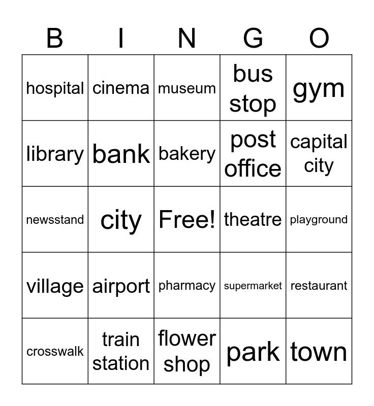 This bingo card has a free space and 24 words: airport, train station, bakery, crosswalk, gym, hospital, library, cinema, theatre, pharmacy, post office, newsstand, supermarket, restaurant, bank, park, playground, museum, capital city, city, town, village, bus stop and flower shop.
