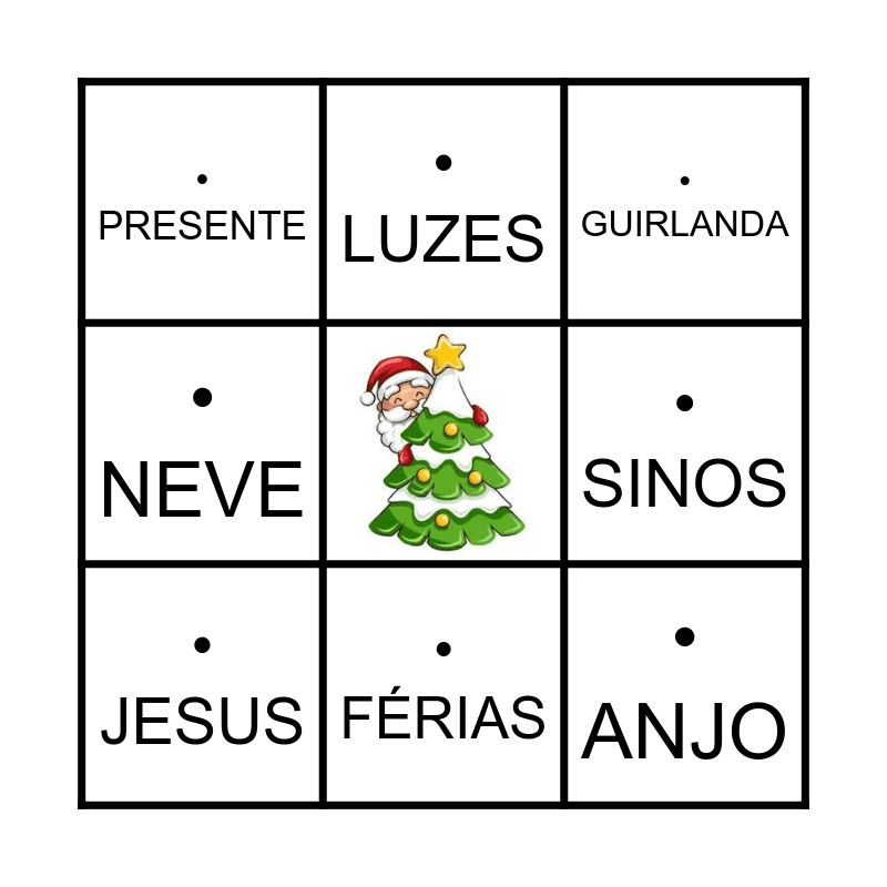 This bingo card has a free space and 16 words: PAPAI NOEL, • ESTRELA, • GUIRLANDA, • PRESENTE, • CEIA, • LUZES, • PAZ, • AMOR, • ANJO, • SINOS, • ÁRVORE, • NEVE, • ALEGRIA, • FÉRIAS, • JESUS and • FAMÍLIA.