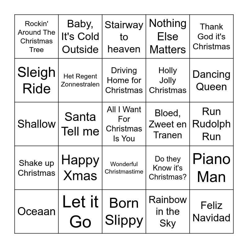 This bingo card has 68 words: Jingle Bell Rock, All I Want For Christmas Is You, It's Beginning To Look a Lot Like Christmas, Let It Snow! Let It Snow! Let It Snow!, Santa Baby, Last Christmas, Baby, It's Cold Outside, Santa Claus is Coming to Town, Driving Home for Christmas, Merry Christmas Everyone, Wonderful Christmastime, Underneath the Tree, Run Rudolph Run, Thank God it's Christmas, Why Couldn't it Be Christmas Everyday, Sleigh Ride, Santa Tell me, Rockin' Around The Christmas Tree, It's the Wonderfull Time of the Year, Happy Xmas, Holly Jolly Christmas, Do they Know it's Christmas?, Shake up Christmas, Feliz Navidad, Bohemian Rhapsody, Fix you, Hotel California, Roller Coaster, Piano Man, Better Days, Stairway to heaven, Avond, Love of My Life, Black, Nothing Else Matters, Africa, Radar Love, Oceaan, Dancing Queen, Shallow, Brabant, Zombie, Het Regent Zonnestralen, Let it Be, Noodgeval, Enjoy The Silence, Sweet Dreams, L'Amour Toujours, Bloed, Zweet en Tranen, Let it Go, Material Girl, Oops! I did it Again, You've Got The Love, Born Slippy, Beat it, Hallelujah, Rainbow in the Sky, Unwritten, Believe, I Gotta Feeling, Everywhere, I'm Still Standing, Born in the U.S.A., Why Tell Me Why, I Will Always Love You, Wannabe, Ich Bin Wie Du and Love nwantiti.