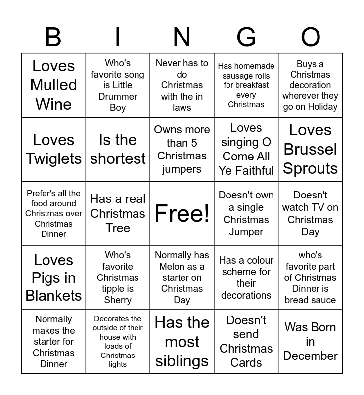 This bingo card has a free space and 50 words: Actually enjoys Christmas music, Was Born in December, Is off to Cornwall for Christmas, Has the most siblings, Who's favorite Christmas tipple is Sherry, Is wearing red or green nail polish, Who's favorite song is Little Drummer Boy, Is having two Christmas Days this year, Loves Twiglets, Has the smallest feet, Is the shortest, Has homemade sausage rolls for breakfast every Christmas, who's favorite part of Christmas Dinner is bread sauce, Has a colour scheme for their decorations, Put their tree up in November, Owns more Christmas Socks than regular socks, Owns more than 5 Christmas jumpers, Doesn't own a single Christmas Jumper, Goes to Church on Christmas Eve, Buys a Christmas decoration wherever they go on Holiday, Has a real Christmas Tree, Doesn't send Christmas Cards, Loves Mulled Wine, Loves singing O Come All Ye Faithful, Always forgets what gifts she has brought, Bought a 7ft Christmas tree for £2.50, Loves Brussel Sprouts, Doesn't put decorations up until after 15th Dec, Never has to do Christmas with the in laws, Normally has Melon as a starter on Christmas Day, Does not like mince pies, Christmas cake or Christmas pudding!, Who's Christmas Tradition is to go for a walk on the beach, Has a Baileys hot chocolate every day in the lead up to Christmas, Still circles the TV Movies they plan to watch in the Christmas Radio Times, Decorates the outside of their house with loads of Christmas lights, Owns more than 5 Christmas Gonks, Who's favourite drink is Advocaat and Cream Soda, Likes to be near water on Christmas Day, Who's favorite tree ornament was brought by a colleague, Doesn't watch TV on Christmas Day, Who’s never gone out on Christmas Eve, Loves to spend Christmas sitting by the fire with a baileys and good book, Was a cow in the nativity at school, Who's never tried Eggnog, Normally makes the starter for Christmas Dinner, Prefer's all the food around Christmas over Christmas Dinner, Has 5 pairs of Christmas PJ's, Favourite Christmas Cocktail is a Twinkle, Loves Pigs in Blankets and Loves Terry's Chocolate Oranges.