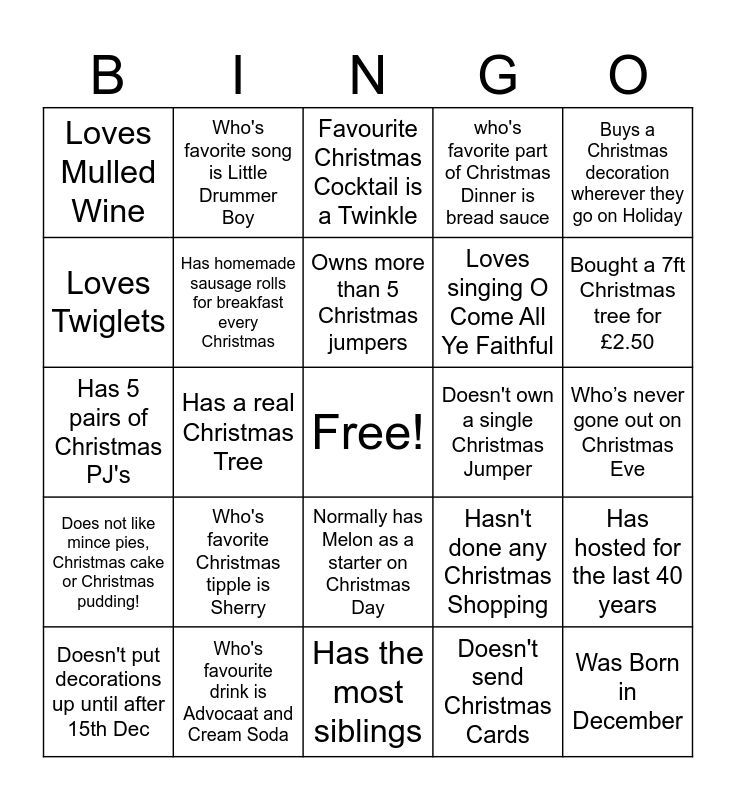 This bingo card has a free space and 49 words: Actually enjoys Christmas music, Was Born in December, Is off to Cornwall for Christmas, Has the most siblings, Who's favorite Christmas tipple is Sherry, Is wearing red or green nail polish, Who's favorite song is Little Drummer Boy, Is having two Christmas Days this year, Loves Twiglets, Is the shortest, Has homemade sausage rolls for breakfast every Christmas, who's favorite part of Christmas Dinner is bread sauce, Has hosted for the last 40 years, Hasn't done any Christmas Shopping, Put their tree up in November, Owns more Christmas Socks than regular socks, Owns more than 5 Christmas jumpers, Doesn't own a single Christmas Jumper, Goes to Church on Christmas Eve, Buys a Christmas decoration wherever they go on Holiday, Has a real Christmas Tree, Doesn't send Christmas Cards, Loves Mulled Wine, Loves singing O Come All Ye Faithful, Always forgets what gifts she has brought, Bought a 7ft Christmas tree for £2.50, Doesn't put decorations up until after 15th Dec, Never has to do Christmas with the in laws, Normally has Melon as a starter on Christmas Day, Does not like mince pies, Christmas cake or Christmas pudding!, Who's Christmas Tradition is to go for a walk on the beach, Has a Baileys hot chocolate every day in the lead up to Christmas, Still circles the TV Movies they plan to watch in the Christmas Radio Times, Decorates the outside of their house with loads of Christmas lights, Who's favourite drink is Advocaat and Cream Soda, Likes to be near water on Christmas Day, Who's favorite tree ornament was brought by a colleague, Doesn't watch TV on Christmas Day, Who’s never gone out on Christmas Eve, Loves to spend Christmas sitting by the fire with a baileys and good book, Was a cow in the nativity at school, Who's never tried Eggnog, Normally makes the starter for Christmas Dinner, Prefer's all the food around Christmas over Christmas Dinner, Has 5 pairs of Christmas PJ's, Favourite Christmas Cocktail is a Twinkle, Loves Pigs in Blankets, Loves Terry's Chocolate Oranges and Who's favorite song is Driving Home for Christmas.