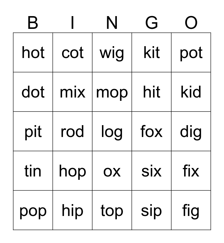 This bingo card has 25 words: hop, top, mop, pop, pot, hot, dot, cot, fox, ox, hit, pit, six, fix, mix, fig, dig, wig, kid, rod, log, hip, tin, kit and sip.