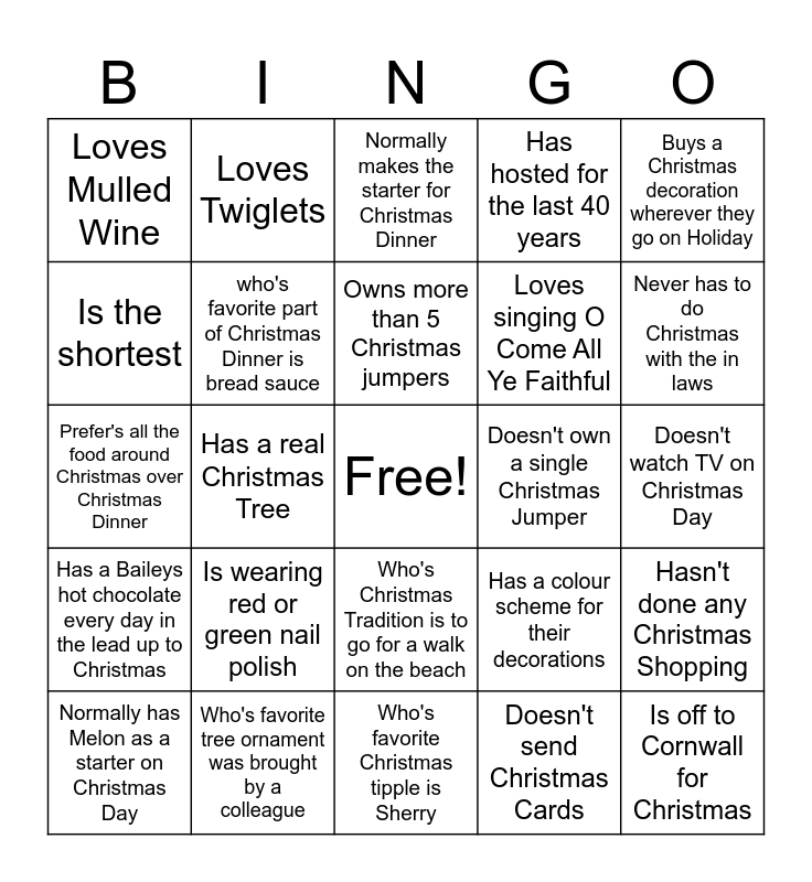 This bingo card has a free space and 47 words: Actually enjoys Christmas music, Is off to Cornwall for Christmas, Has the most siblings, Who's favorite Christmas tipple is Sherry, Is wearing red or green nail polish, Is having two Christmas Days this year, Loves Twiglets, Has the smallest feet, Is the shortest, Has homemade sausage rolls for breakfast every Christmas, who's favorite part of Christmas Dinner is bread sauce, Has hosted for the last 40 years, Hasn't done any Christmas Shopping, Has a colour scheme for their decorations, Put their tree up in November, Owns more Christmas Socks than regular socks, Owns more than 5 Christmas jumpers, Doesn't own a single Christmas Jumper, Goes to Church on Christmas Eve, Buys a Christmas decoration wherever they go on Holiday, Has a real Christmas Tree, Doesn't send Christmas Cards, Loves Mulled Wine, Loves singing O Come All Ye Faithful, Always forgets what gifts she has brought, Never has to do Christmas with the in laws, Normally has Melon as a starter on Christmas Day, Does not like mince pies, Christmas cake or Christmas pudding!, Who's Christmas Tradition is to go for a walk on the beach, Has a Baileys hot chocolate every day in the lead up to Christmas, Still circles the TV Movies they plan to watch in the Christmas Radio Times, Decorates the outside of their house with loads of Christmas lights, Owns more than 5 Christmas Gonks, Who's favourite drink is Advocaat and Cream Soda, Likes to be near water on Christmas Day, Who's favorite tree ornament was brought by a colleague, Doesn't watch TV on Christmas Day, Who’s never gone out on Christmas Eve, Loves to spend Christmas sitting by the fire with a baileys and good book, Was a cow in the nativity at school, Who's never tried Eggnog, Normally makes the starter for Christmas Dinner, Prefer's all the food around Christmas over Christmas Dinner, Has 5 pairs of Christmas PJ's, Favourite Christmas Cocktail is a Twinkle, Loves Pigs in Blankets and Who's favorite song is Driving Home for Christmas.