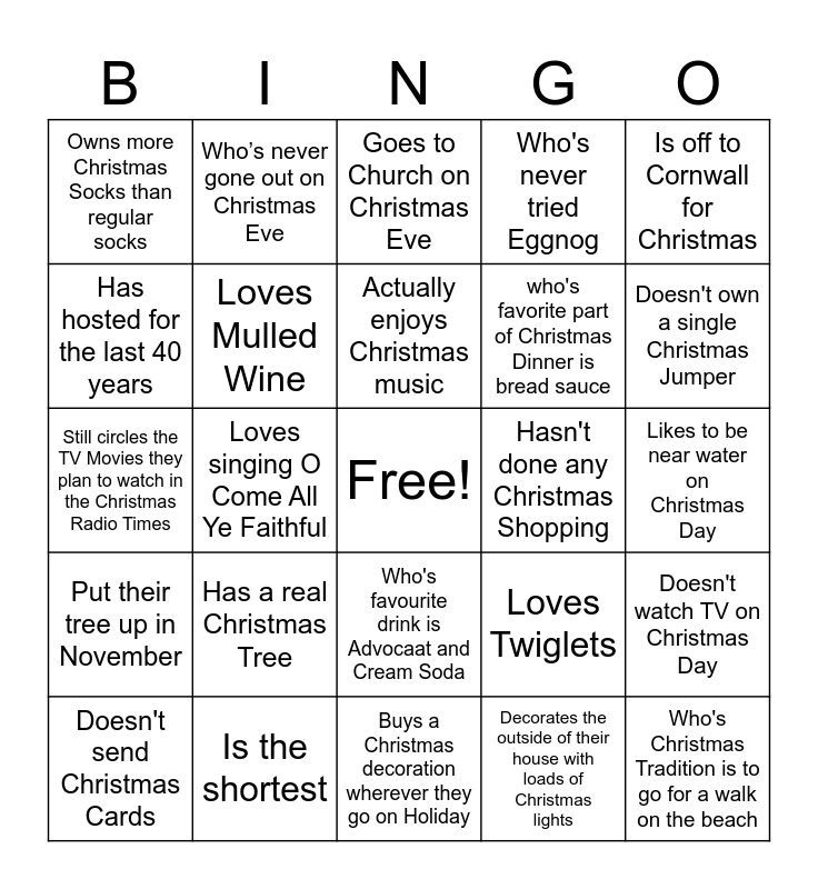 This bingo card has a free space and 47 words: Normally has Melon as a starter on Christmas Day, Who's Christmas Tradition is to go for a walk on the beach, Prefer's all the food around Christmas over Christmas Dinner, Buys a Christmas decoration wherever they go on Holiday, Has a real Christmas Tree, Does not like mince pies, Christmas cake or Christmas pudding!, Who’s never gone out on Christmas Eve, Is having two Christmas Days this year, Has hosted for the last 40 years, Loves Pigs in Blankets, Loves Mulled Wine, Who's never tried Eggnog, Doesn't watch TV on Christmas Day, Loves Twiglets, Normally makes the starter for Christmas Dinner, Was a cow in the nativity at school, Actually enjoys Christmas music, Hasn't done any Christmas Shopping, Always forgets what gifts she has brought, Is off to Cornwall for Christmas, Loves singing O Come All Ye Faithful, Decorates the outside of their house with loads of Christmas lights, Owns more Christmas Socks than regular socks, who's favorite part of Christmas Dinner is bread sauce, Who's favorite tree ornament was brought by a colleague, Doesn't own a single Christmas Jumper, Doesn't send Christmas Cards, Has the most siblings, Who's favourite drink is Advocaat and Cream Soda, Put their tree up in November, Owns more than 5 Christmas jumpers, Is wearing red or green nail polish, Has the smallest feet, Favourite Christmas Cocktail is a Twinkle, Who's favorite Christmas tipple is Sherry, Is the shortest, Likes to be near water on Christmas Day, Loves to spend Christmas sitting by the fire with a baileys and good book, Has a colour scheme for their decorations, Who's favorite song is Driving Home for Christmas, Never has to do Christmas with the in laws, Goes to Church on Christmas Eve, Still circles the TV Movies they plan to watch in the Christmas Radio Times, Owns more than 5 Christmas Gonks, Has homemade sausage rolls for breakfast every Christmas, Has 5 pairs of Christmas PJ's and Has a Baileys hot chocolate every day in the lead up to Christmas.